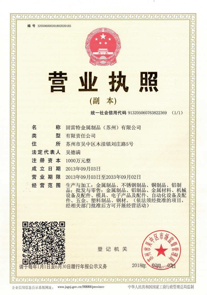 固雷特金屬制品(蘇州)有限公司,合資公司。于2013年成立,投資額1000萬人民幣,專業(yè)生產(chǎn)經(jīng)營易切削鋼自動車床用料,我司所出售材料均可提供SGS公司符合《歐盟RoHS重訂指令2011/65/EU的六項 環(huán)保 檢測報告》(另:加工各類金屬材料表面拉花,與板材棒材整平校直。)